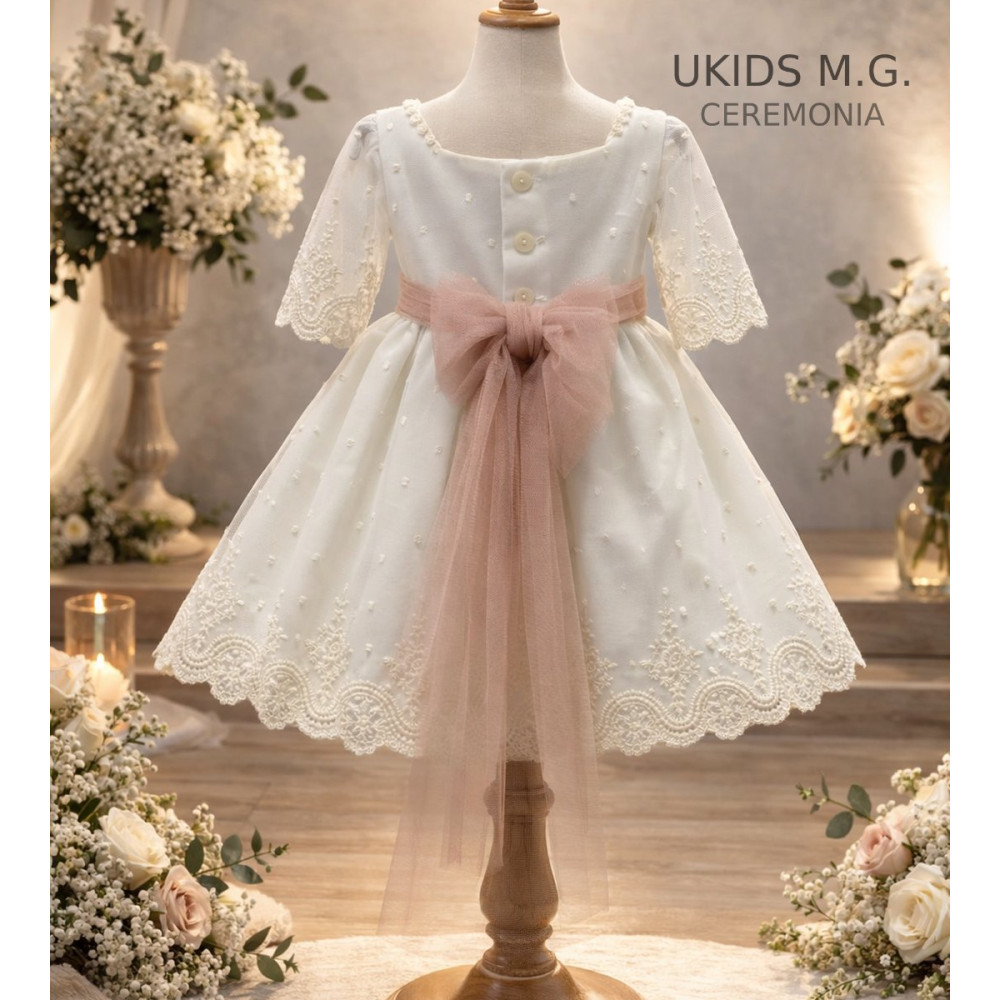 VESTIDO TUL BORDADO MANGA FRANCESA crudo/rosa